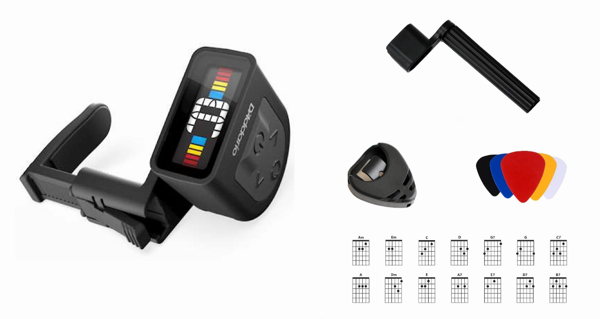 - Umożliwia nastrojenie gitar klasycznych, akustycznych i elektrycznych, basu, mandoliny, banjo, ukulele i innych instrumentów strunowych