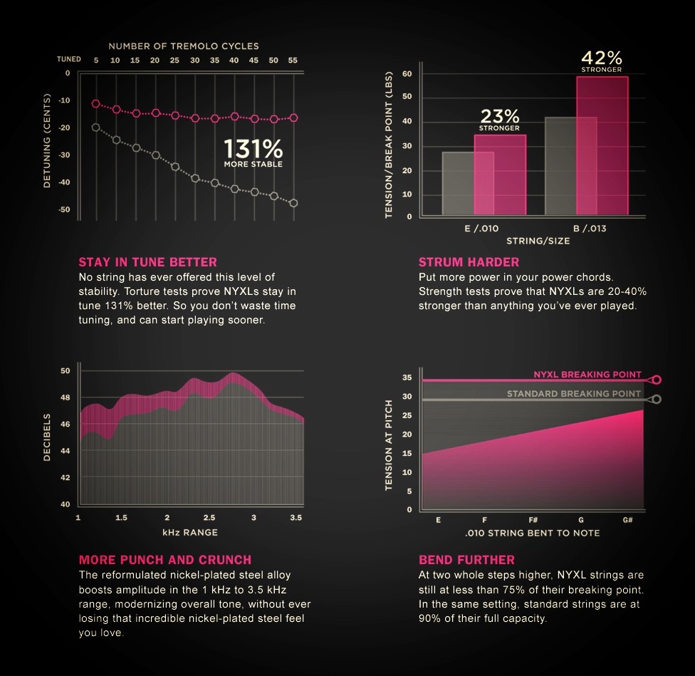 Seria NYXL stworzona została z myślą o tym, żeby grać głośniej, mocniej i dłużej pozostać w stroju. Struny NYXL dopracowane zostały w każdym calu: zaczynając od zaprojektowanego na nowo, odpornego na zrywanie rdzenia z wysokowęglowej stali, aż po nową niklowaną owijkę, dzięki której struny NYXL uzyskują o 6% większą przenikalność magnetyczną, dającą silniejszy sygnał w zakresie 2-5 kHz, co znacznie przekłada się na ich "pazur". Dzięki zupełnie nowemu procesowi produkcji, i przerobionemu procesowi ciągnięcia stali nowa seria D'Addario jest mocniejsza, i pozwala na utrzymanie stroju o 131% bardziej niż standardowe komplety. NYXL to krok milowy w dziejach firmy D'Addario, wyznaczający nowe standardy wśród strun do gitar elektrycznych.