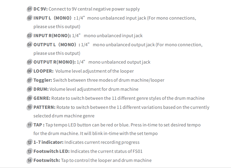⭐ Intuicyjny interfejs – dwa niezależne pokrętła głośności (dla looper’a i perkusji), przycisk TAP TEMPO i kolorowe wskaźniki LED