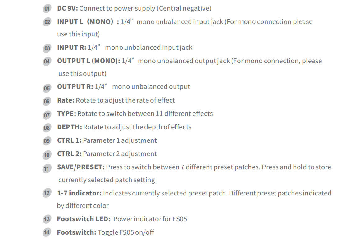 Efekty : Chorus, Flanger, Tremolo, Phase, Vibrato, Rotary, Liquid, Auto Wah, Stutter, Ring, Low Bit
