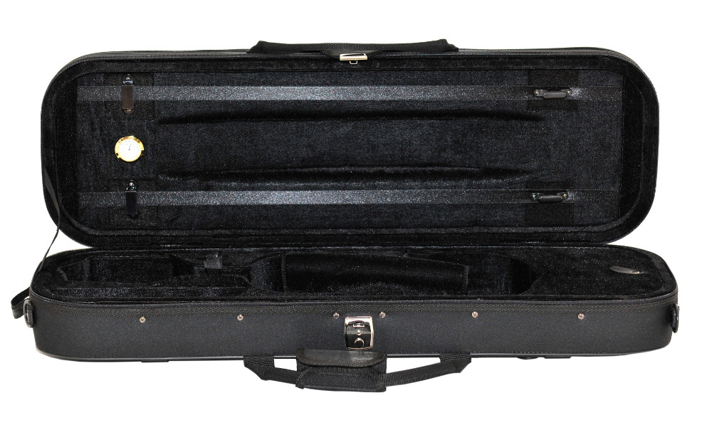 Wnętrze futerału pokryte jest miękkim welurem doskonale chroniącym skrzypce przed uszkodzeniami mechanicznymi. Dopasowana kształtowa komora zabezpiecza instrument przed przesuwaniem się podczas transportu.