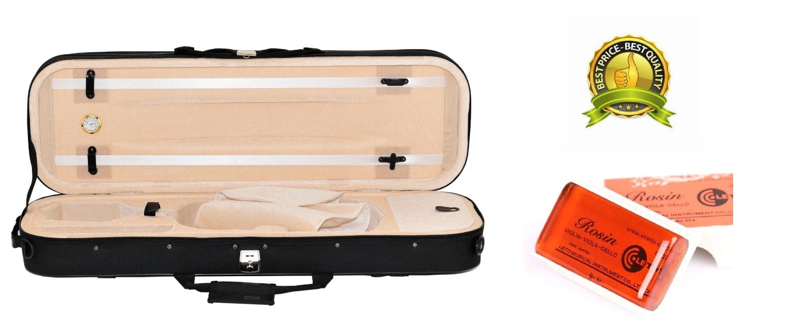 Znajdują się tam również dwa uchwyty na smyczki, zamykany praktyczny schowek na akcesoria oraz miękka tkanina do przykrywania skrzypiec.