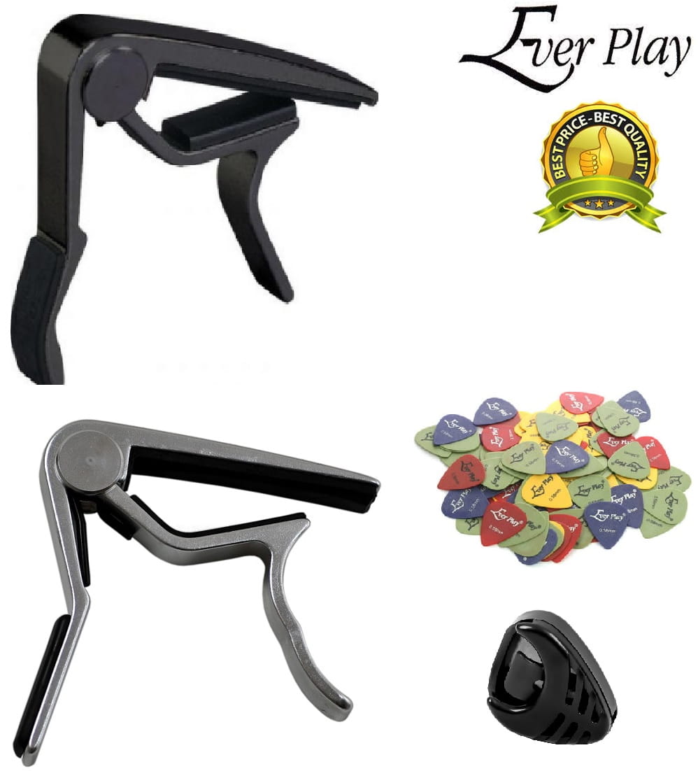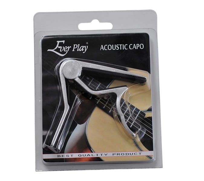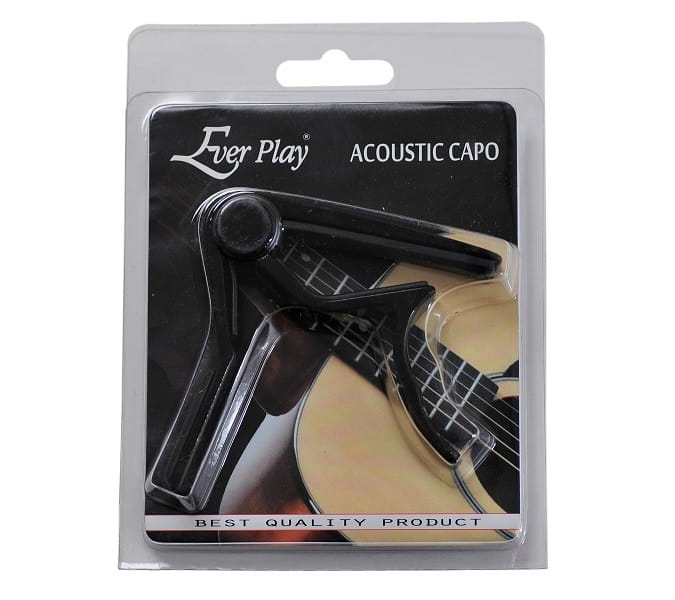 Lekki, solidny kapodaster EVER PLAY w kolorze czarnym lub chromowanym z mocną i trwałą sprężyną gwarantującą odpowiedni docisk wszystkich strun do gryfu.