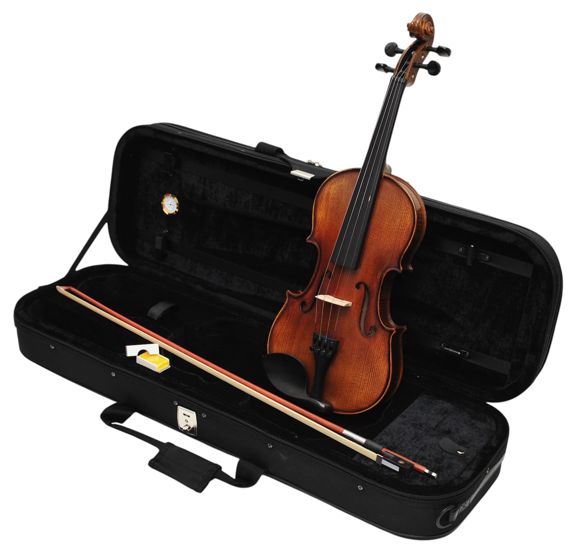 - Futerał piankowy: Skrzypce sprzedawane są z lekkim futerałem piankowym, który zapewnia odpowiednią ochronę instrumentu podczas transportu, umożliwiając bezpieczne przechowywanie oraz łatwe zabranie skrzypiec na lekcje czy występy.
