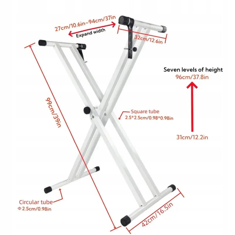 X4 to solidny, składany stojak pod keyboardy, syntezatory, pianina cyfrowe itp. Z naszym statywem nie musisz się martwić o stabilność rozwiązania. Podwójne metalowe profile o dużej nośności wraz z antypoślizgowymi nóżkami gwarantują bezpieczeństwo twojego urządzenia. Statyw Ambra ma duży zakres regulacji wysokości (aż 7) i składaną krzyżowo konstrukcję o wadze własnej około 3 kg. To idealne połączenie stabilności i mobilności produktu.