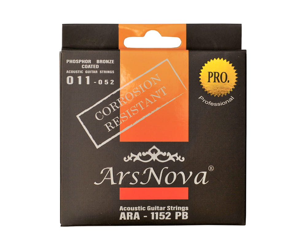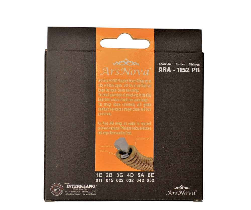 Ars Nova Pro ARA Phosphor Bronze to struny do gitary akustycznej zrobione ze stopu 94,8% miedzi i 5% cyny co pozwala na dłuższą żywotność niż struny ze standardowego stopu brązu. Mały procent fosforu w stopie wpływa na dłuższe zachowanie jasnego brzemienia strun. Większa amplituda wibracji strun przekłada się na nieco ostrzejszy, czystszy i precyzyjny dźwięk. Struny Ars Nova Pro ARA powlekane są specjalną warstwą zwiększającą odporność na korozję, co spowalnia utlenianie się metalu i zdecydowanie wydłuża ich żywotność.