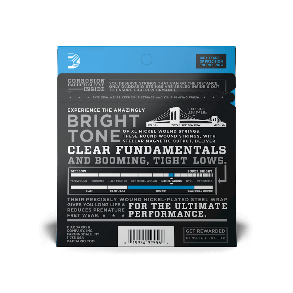 EXL160-5 to 5-strunowa wersja bestsellerowego zestawu basowego EXL160 firmy D'Addario. Struny do gitary basowej XL Nickel Wound, od dawna uznawane są za standard branżowy, są idealne do szerokiej gamy stylów muzycznych.