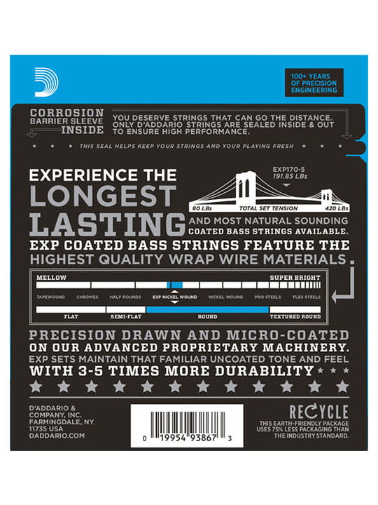 D’Addario EXL170 to 5-strunowa wersja najlepiej sprzedającego się zestawu do elektrycznych gitar basowych z dodatkową struną B .130. Jest to najbardziej uniwersalny zestaw strun idealny dla większości stylów muzycznych. Zaprojektowany do instrumentów o menzurze do 36 i 1/4 cala.