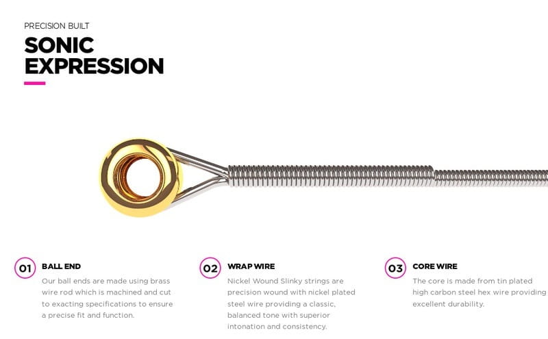 Ernie Ball Slinky są jednymi z najczęściej wybieranych strun do gitary elektrycznej. Posiadają stalowy, cynowany rdzeń o przekroju heksagonalnym. Owijka wykonana jest z wysokogatunkowej stali pokrytej niklem, co przedłuża czas ich użytkowania uodparniając je na korozję. Struny z serii Slinky znane są z ich wyrazistego, brzmienia, pozbawionego metalicznej góry. Dźwięk jest bardziej miękki i mniej agresywny. Wyrabiane są według najwyższych standardów i szczegółowych wytycznych, by zapewnić trwałość i rewelacyjne brzmienie.