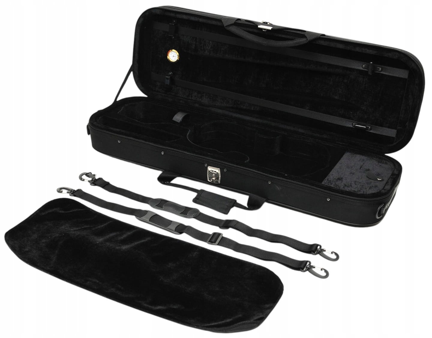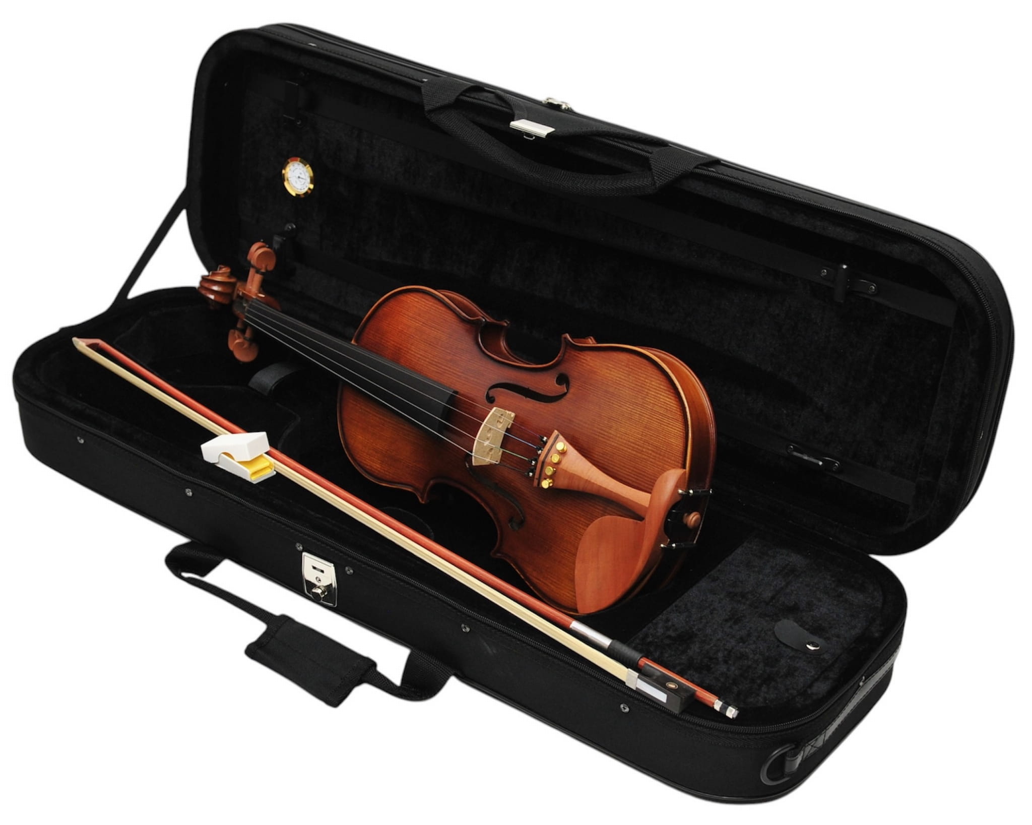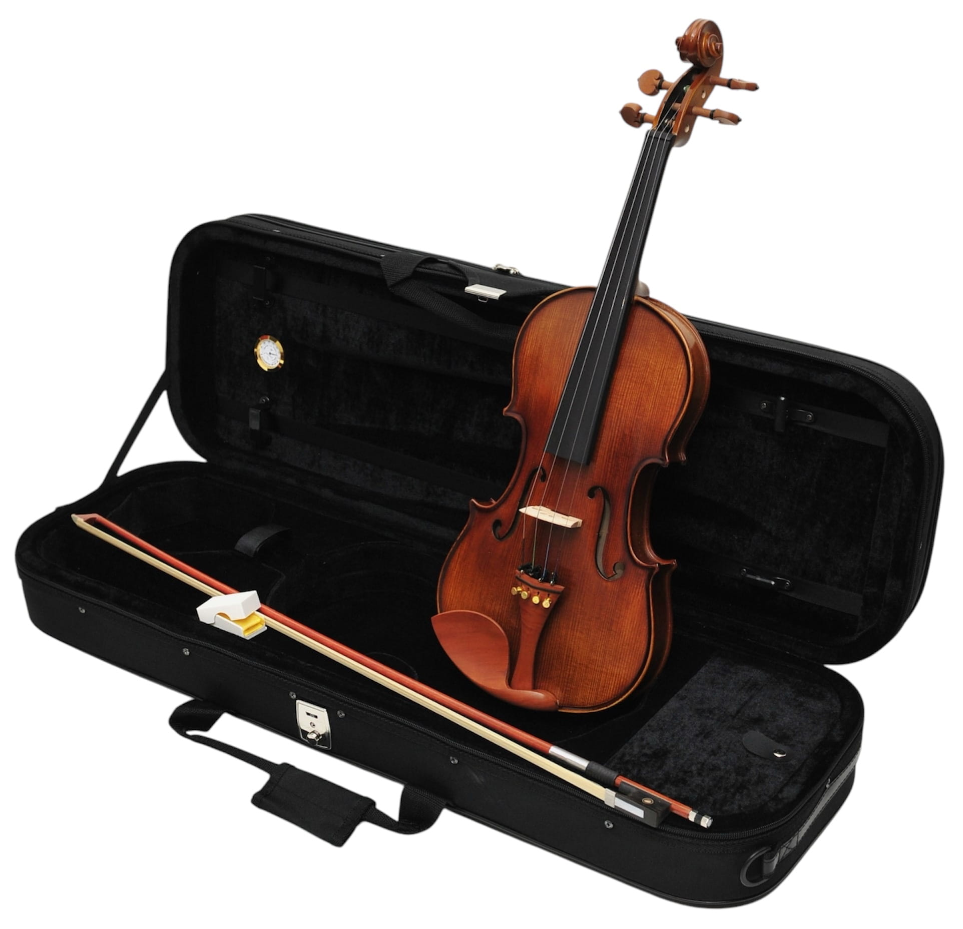 4. Futerał piankowy z higrometrem: Skrzypce są dostarczane w lekkim futerale piankowym, który zapewnia doskonałą ochronę podczas transportu. Dodatkowo, futerał wyposażony jest w higrometr, co pozwala na monitorowanie poziomu wilgotności, istotnego dla zachowania optymalnych warunków przechowywania instrumentu.