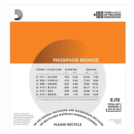 Struny D'Addario EJ15 wykonane są z brązu fosforowego, dzięki czemu posiadają niższe napięcie dla uzyskania brzmienia vintage. Ponadto struny z serii Phosphor Bronze dają ciepłe, jasne, zbalansowane i długotrwałe brzmienie akustyczne. Posiadają owijkę, która chroni je przed korozją tym samym przedłużając ich żywotność. Ponadto mają stalowy rdzeń o przekroju sześciokąta (heksagonalnym).
