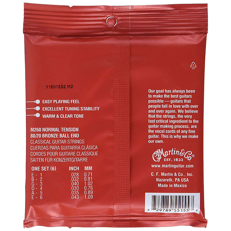 Martin M260 to dobrej jakości struny do gitary klasycznej. Odpowiednia twardość daje sprężysty, mocny dźwięk, lecz nie wymaga jeszcze bardzo silnego dociskania. Charakterystyczną cechą modelu M260 jest wyrównane brzmienie. Są to znakomite struny do codziennych ćwiczeń - przystępne cenowo, markowe i wykonane na wysokim poziomie. Struny zakończone kulką co sprawia, że nie wymagają wiązania na mostku.